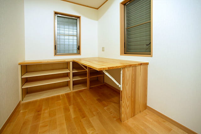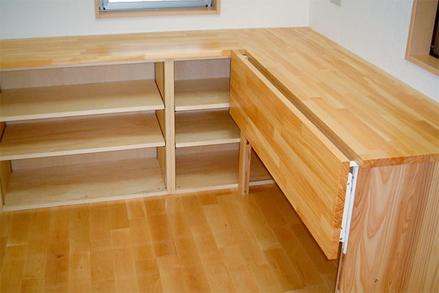 作業台の手前の部分を折りたたんで、スペースを無駄なく使えます。 収納棚と作業台を同じ高さにすることで、作業スペースが広く取れるようにしました。