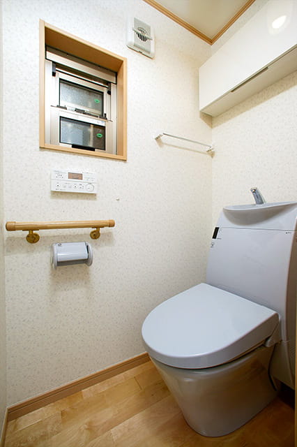和式だったトイレは洋式にリフォームしました。 洋式トイレの方が身体に負担が少ないので、ご高齢の方にもおすすめ。 手すりも取り付けたので、安全にお使いいただけます。