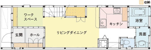 木のぬくもりあふれる玄関を入ると、広々としたリビングダイニング。奥様の趣味に使うワークスペースも用意しました。水まわりも一新し、洗濯機をキッチン横に置くことで、家事動線がスムーズになっています。