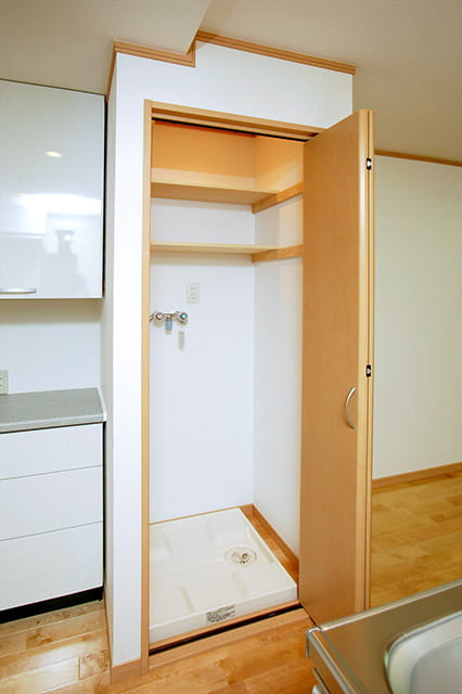動線を考慮して、キッチンの横に洗濯機置場を設置しました。 キッチンにいる時間が長い奥様にとって、キッチンの横に洗濯機があるのはとっても便利。 家事動線もスムーズになりました。