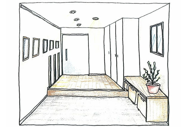 玄関照明は、角度が変えられるユニバーサルダウンライトを採用。ご主人様が趣味で撮った写真をピクチャーレールで飾り、ライトアップしてお楽しみいただけます。図面ではイメージがつかみにくいため、リフォーム前にイメージパースでご確認いただきました。