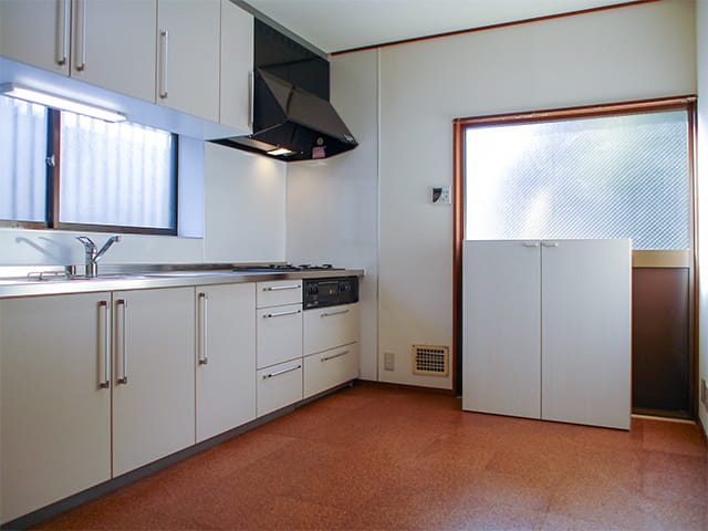 キッチンスペースには大きな窓と引違いの勝手口がありましたが、勝手口は利用しないとのことで、防犯性を考慮して出入りできないように塞ぎました。 ガラスは網入りに替えましたが、窓の大きさはそのままなので、採光は十分。明るいキッチンスペースです。