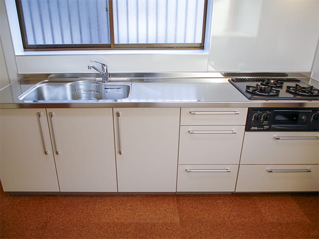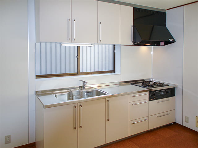 システムキッチンを交換し、明るく安全なキッチンに。水まわりの機器も新しいものに替えて、快適に使えるようにします。