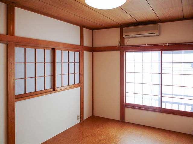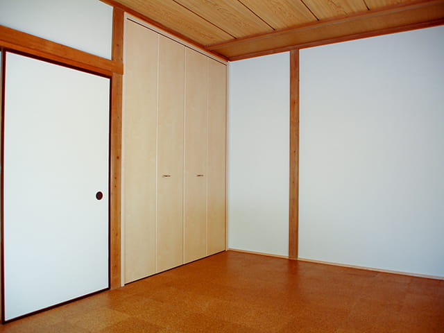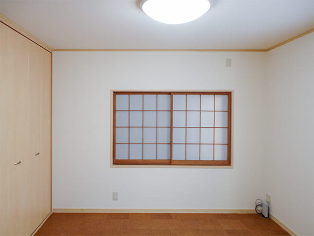 2階の和室を、床はコルクタイル、壁はエコクロスに張り替え、寝室としてリフォームしました。 こちらのコルクタイルもA様がDIYで施工したものです。 コルクタイルはお手入れが簡単なのもうれしいポイントです。