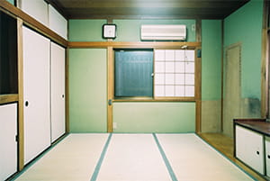 木の天井にグリーンの壁という和室らしい設えでしたが、天井と壁に白いエコクロスを張り、明るいインテリアに変身しました。