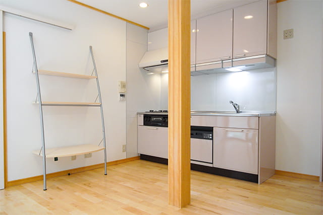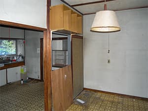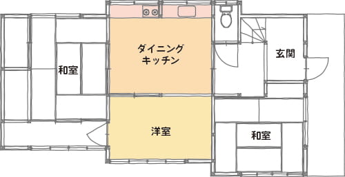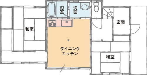 今回リフォームするのは、ダイニングキッチンと洋室の2部屋です。 2部屋を一緒にしてダイニングキッチンを広めに取り、残りのスペースに浴室と洗面室を新しく造ります。 ダイニングキッチンの床は無垢フローリングに。設備も新しいものに交換します。