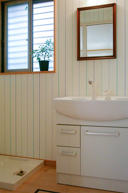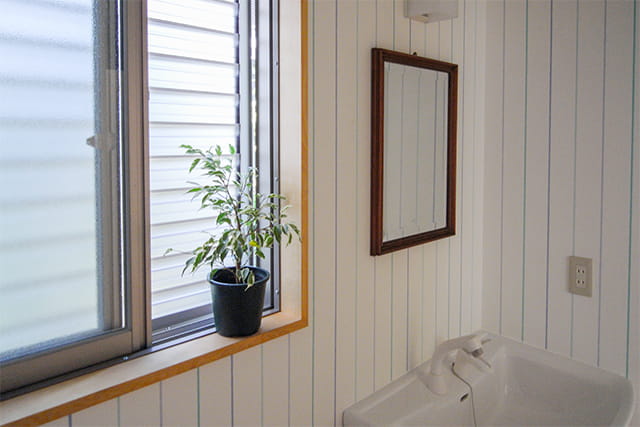 洗面台は既製品の下台のみを設置し、正面にK様がお持ちだったクラシカルな木枠のミラーを取り付けました。 お引き渡し後、K様が窓辺にグリーンを飾ってくださって、毎日洗面を使うのが楽しくなりそうです。
