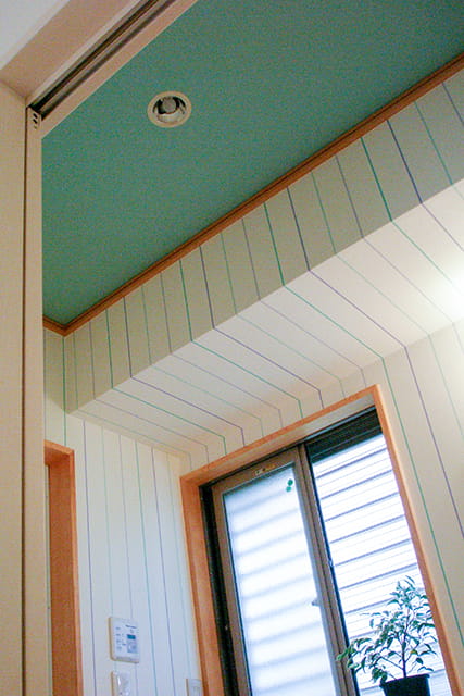 壁には白地にブルーとパープルのストライプが入ったクロス、天井には鮮やかなライトブルーのクロスを張りました。 メーカーからサンプルを取り寄せ、K様と悩みに悩んで決定したクロスです。 洗面室に一歩足を踏み入れると、まるで青空の下にいるようです。ポップでありながら大人っぽさも感じるお部屋になりました。