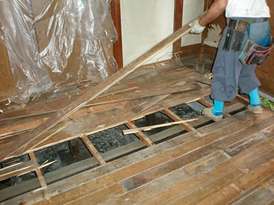 床の断熱工事のため、まずダイニングキッチンの床を剥がします。 下地を点検したところ、劣化が見られたため、新しく造り直すことになりました。
