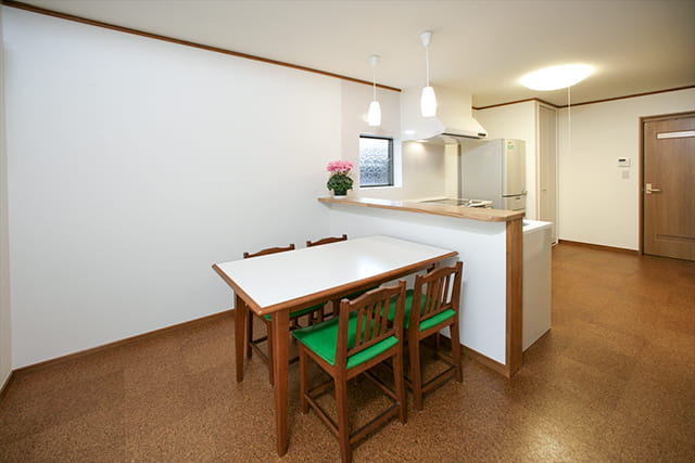 コルクタイルは水に強いのでキッチンにもおすすめです。 冬は暖かく、夏はサラッとした感触で、素足でも気持ちよく過ごせます。