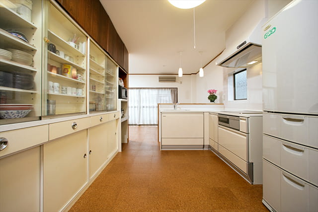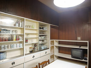 この食器棚は両側から使えるようになっていて、使いやすいように奥行きが浅めに造られていました。 愛着のある食器棚をそのまま使いたいとのご要望で、位置を少しだけ変えて残すことになりました。