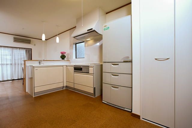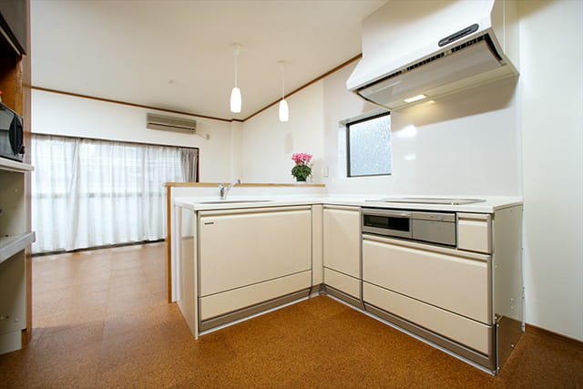 キッチンスペースが広がって、スタイルも自由度が高くなったので、壁付けキッチンからL型キッチンに変わりました。 採光が望めないことから、キッチン前の大きな窓は閉じて、冷蔵庫置場と洗濯機置場を並べ、スッキリ使いやすい空間になっています。