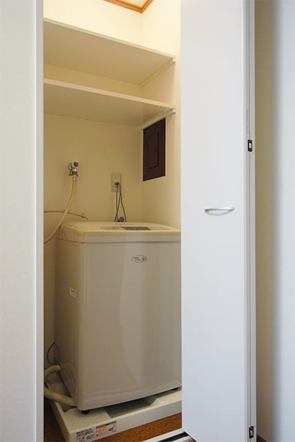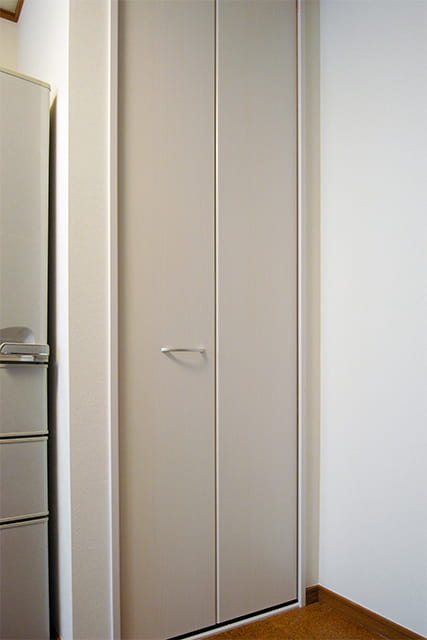 キッチンと並べて洗濯機置場を設け、リフォーム前は洗面室に置かれていた洗濯機を移動しました。 扉がついているので、中に洗濯機があるようには見えません。