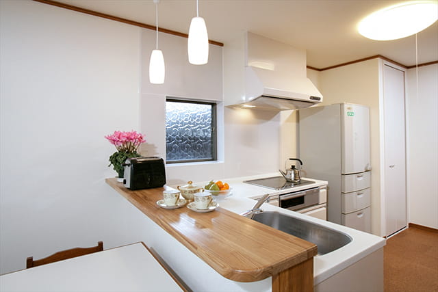 キッチンは対面キッチンにしたので、明るいダイニングを見ながらお料理できます。 食事の準備や後片付けも効率良くでき、ご夫婦の会話も増えそうです。