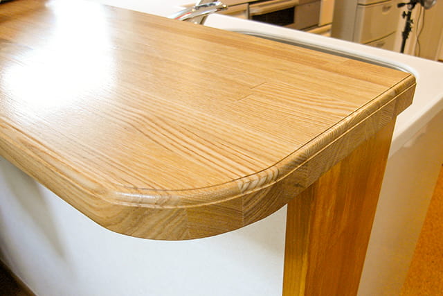 キッチンカウンターは無垢材で造作しました。使い勝手のいい20cm~25cm幅に収まるサイズです。 ベテランの大工さんが、角の部分を丸い自然なカーブに仕上げてくれました。 角がとがっていると、ぶつけてケガをしたり、お洋服がひっかかることも。職人技で安心なカウンターになりました。