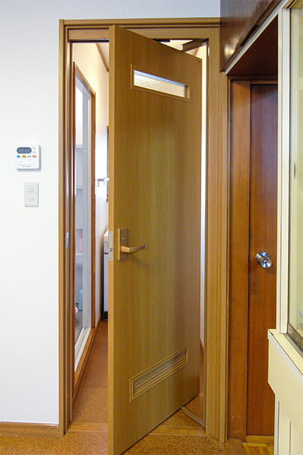 ローリングドアは、ドアが回転する形で開くので、開閉に使うスペースが少なくて済みます。 開いた時に扉の出る幅が少なく、デッドスペースもできにくいので、廊下に面したトイレなどに向いています。