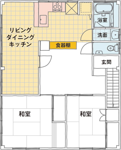 O様のご希望に合わせて、ご自宅で生活しながらリフォームしやすいプランをご提案しました。 工事範囲を広げすぎず、お部屋の雰囲気もあまり変えないプランとなっています。