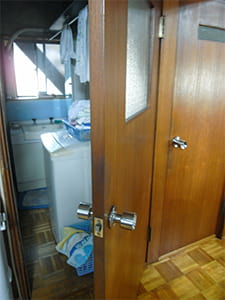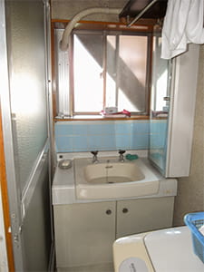 洗面室のドアは通路側に開くため、リフォーム前は開けた扉が通路を塞いで、使い勝手が良くありませんでした。 そこで、今回のリフォームでローリングドアを採用しました。