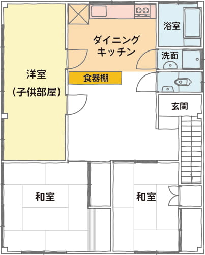 今は使われていないお子さんのお部屋を、隣にあるダイニングキッチンと繋げて、2部屋を1部屋にするリフォーム計画を立てました。 間取りの変更だけでなく、キッチンやお風呂などの設備もずっと使いやすいものに交換します。
