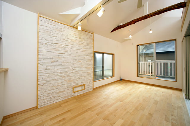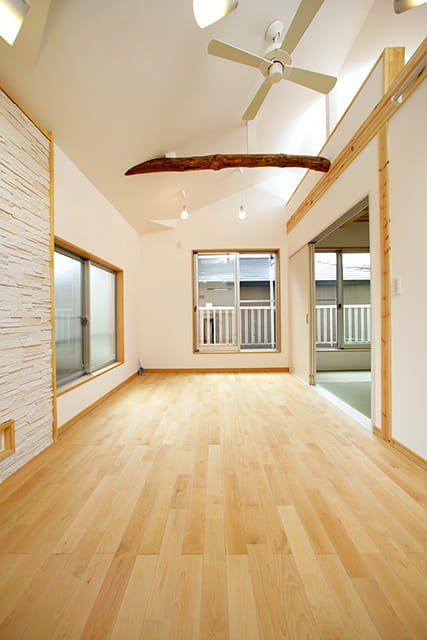 何より印象的なのは、お二人が強く希望されていた吹き抜け天井です。 吹き抜け天井があるお陰で、より広がりが感じられるお部屋になりました。