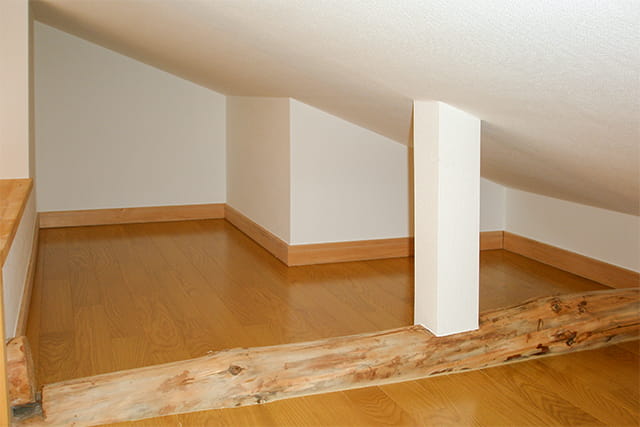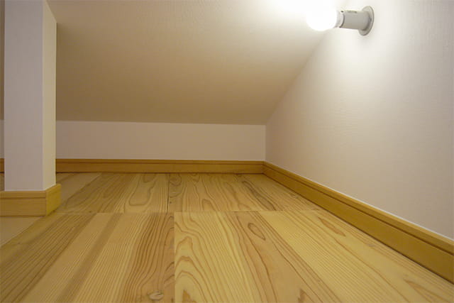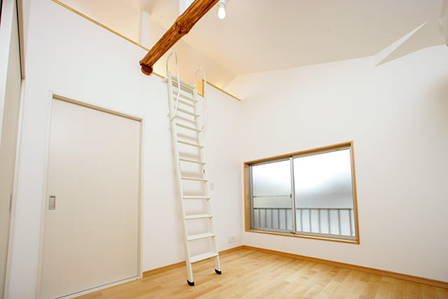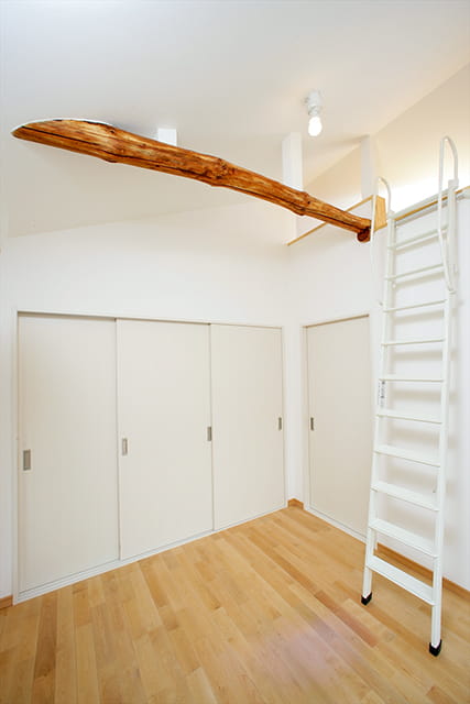 リビングダイニングからハシゴ階段を上がると、3畳ほどの広さの空間となっています。 季節の物や、たまにしか使わないような物を収納しておくのに便利です。