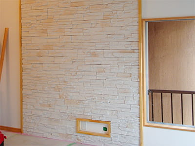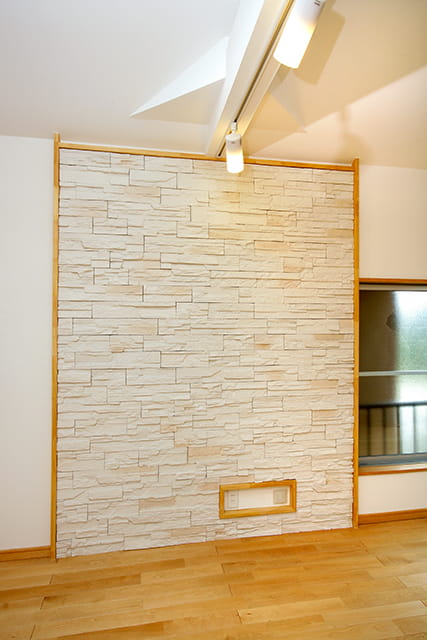 最後の仕上げに、レンガ調のアクセントパネルをリビングに施工しました。 お二人がとあるレストランで見かけて、「これ素敵!」と感激されたそうです。
