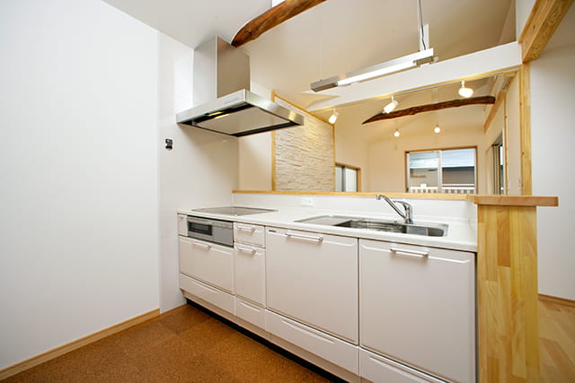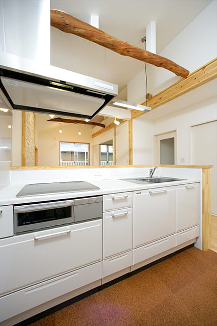 キッチンまわりは水を使うので、水に強いコルクタイルを採用しました。 コルクはワインの栓にも使われているように、耐水性に優れた自然素材です。 ソフトでサラッとした肌触りで、居室の床材としても人気です。