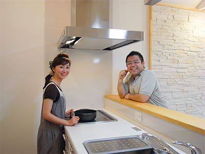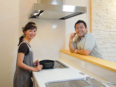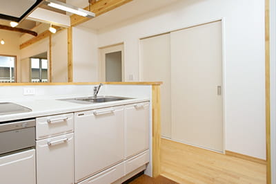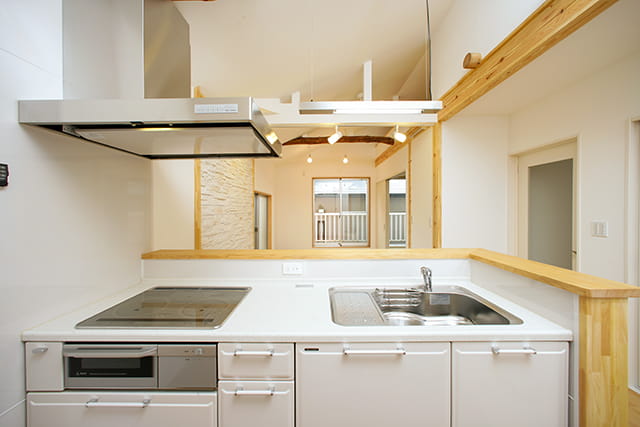 お料理やお菓子作りが趣味の奥様が希望されていた対面キッチンです。 吊り戸棚を設けないオープンなタイプなので、お料理中もご家族とコミュニケーションが取れます。