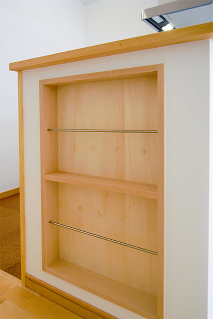 キッチンの袖壁には、マガジンラックを造作しました。 リビングに入ると正面に見える場所なので、素敵なアクセントになります。 お料理の本や可愛い絵本を飾って、おしゃれにお使いいただけます。