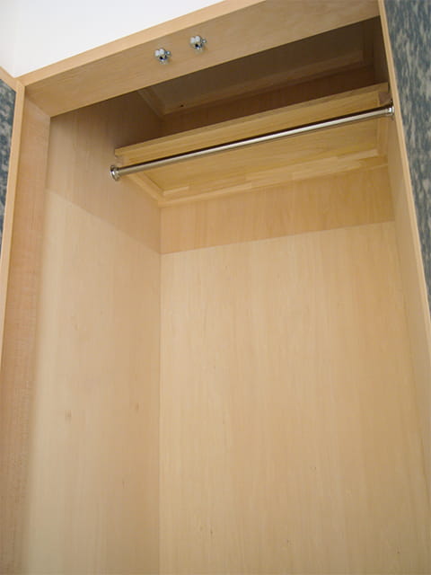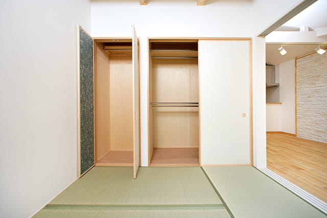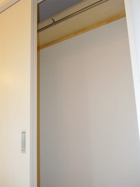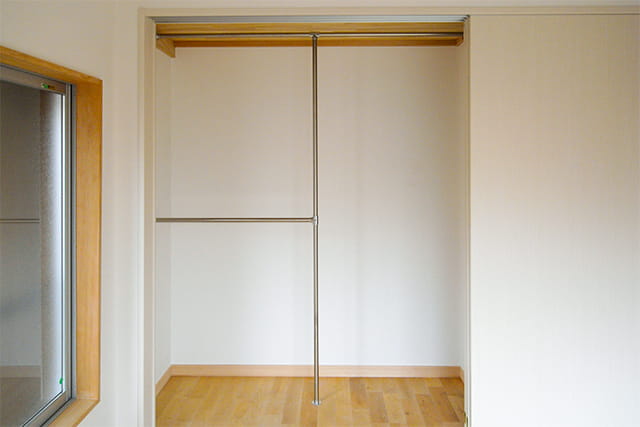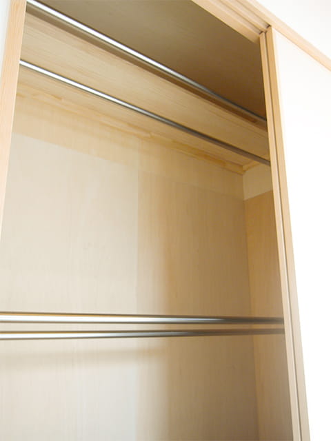 和室の押入れは、実際に使うシーンを想定して、形やサイズを決めています。 圧縮した布団を2組ほど、あとはハンガーにかけたお洋服をしまうとのことで、中棚は造らず、ハンガーパイプを設置しました。
