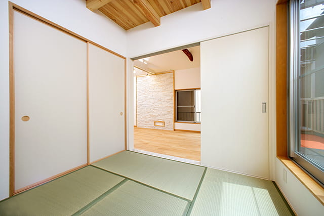 普段はリビングから続く和室として使い、引き戸を外してさらにリビングと一体感をもたせることもできます。 来客時には引き戸を閉めて、客間としても使えるフレキシブルな和室です。