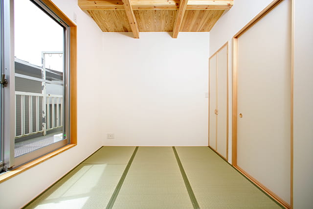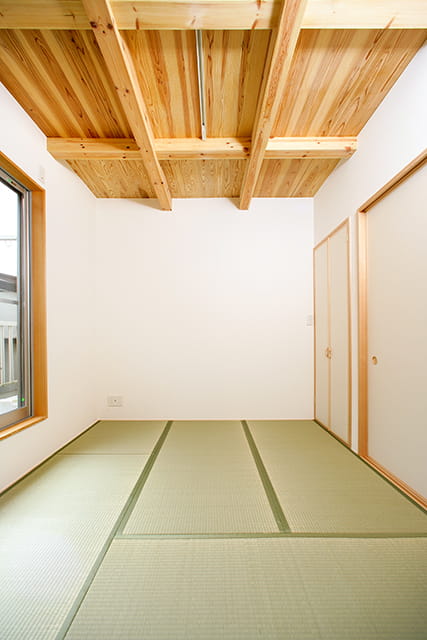 和室も梁を見せて、天井を高く仕上げました。天井に使われているのは、国産杉の板をを三層に重ねて作られる「Jパネル」です。 Jパネルは厚さが36mmあり、強度も十分なため、1階の天井と2階の床をJパネル1枚で施工することができます。