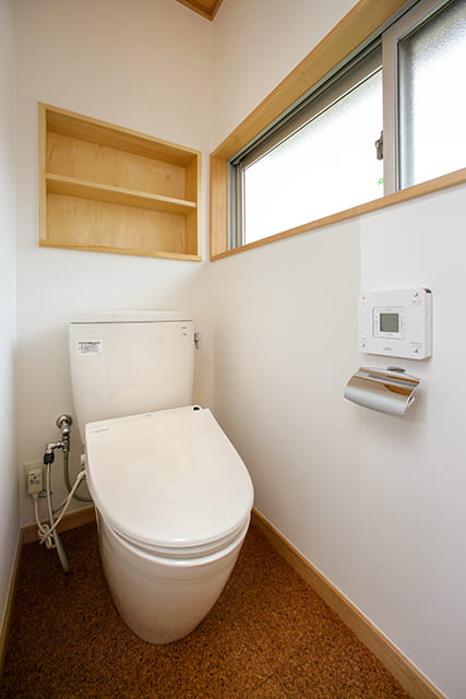 トイレの奥の棚は、トイレットペーパーが縦に2段並ぶサイズです。 床は水に強い自然素材、コルクタイルを採用しました。