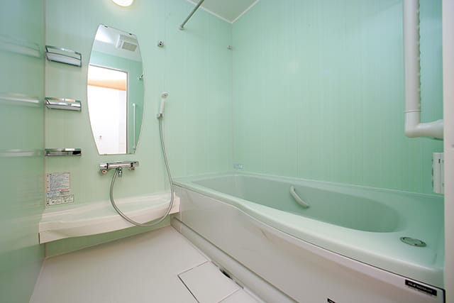 浴室はサンウェーブ(現LIXIL)のユニットバスを選ばれました。 さわやかなグリーンのお風呂で、一日の疲れをゆっくり癒やしていただけます。