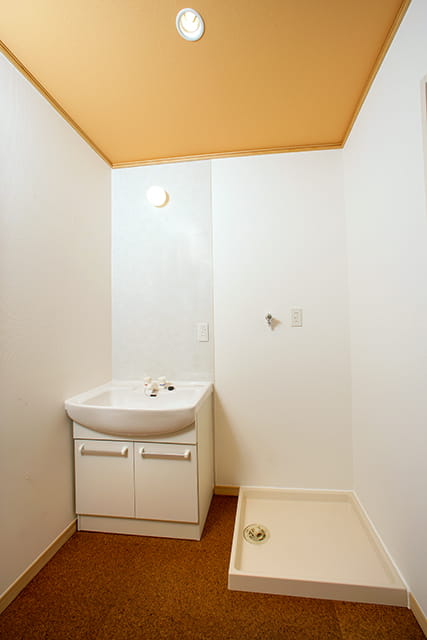 洗面室の天井は、トイレと同じく、オレンジ色のアクセントクロスで仕上げました。 床も同様にコルクタイルを採用。洗面台の鏡はお引渡し後に設置されました。
