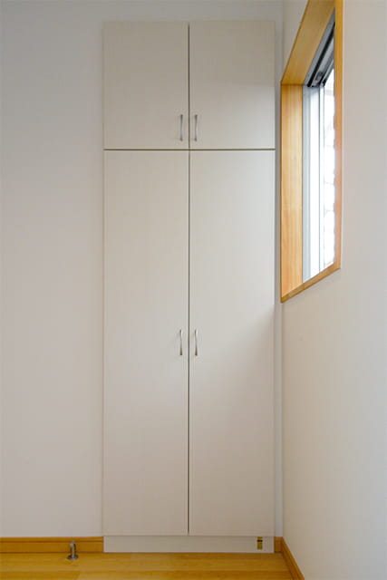 後から棚を置いて使われるとのことで、食料品のストックや、普段使いの掃除機などをしまって、便利にお使いいただけます。