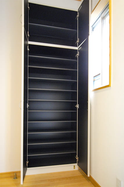 玄関収納は、天井までのサイズの大きなものを選びました。 中棚は自由に動かせるので、スニーカーやブーツなど、いろいろな靴がたっぷり入ります。