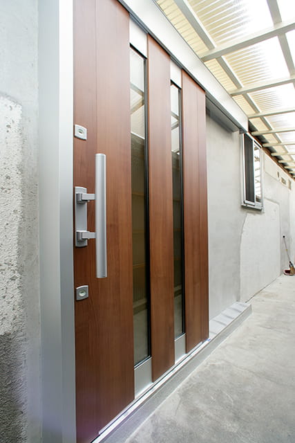 玄関扉もすっかり明るく生まれ変わりました。 アルミと木目調を組み合わせたデザインの玄関扉は、S様ご夫婦がショールームで選ばれたものです。 開き戸から引き戸に交換して、開けたままでも邪魔にならず、使い勝手が良くなりました。