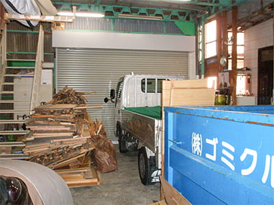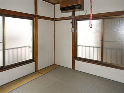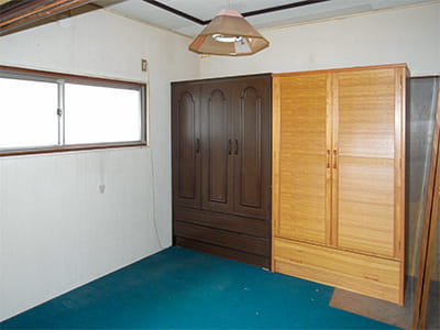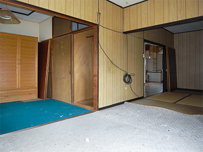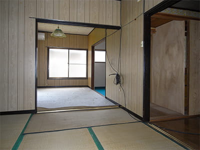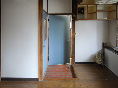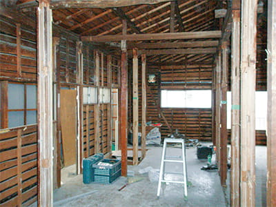 S様がリフォームされたい建物は、1階は鉄骨造の空間で、2階に木造部分が乗っている形です。 1階はS様のお父様がかつて経営されていた会社の倉庫で、2階は従業員さんのお住まいとして、1Kの個室が3つ並んでいたそうです。 その後、2階の仕切りを取り払い、S様ご家族がお住まいだった時期もありますが、現在は空き家となっています。