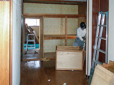 まず建物の解体を行います。 S様邸は何度かリフォームを繰り返しているため、壁をはがすと、下からまた古い壁が現れました。 廃材が多く出ることになりますが、家を建て替える際の廃材と比べれば、はるかにエコロジーです。