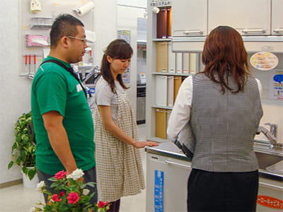 初めにトステム(現LIXIL)のショールームで、窓サッシと玄関引戸をご覧いただき、次にタカラスタンダードで、キッチンとお風呂をご覧いただきました。