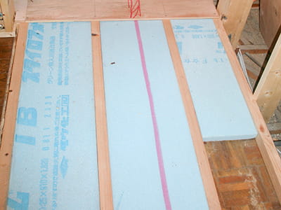 床の下地の間にシート状の断熱材を施工します。1階の倉庫から冷気が上がってくるのを防ぎ、外気の影響を受けにくいお住まいにします。