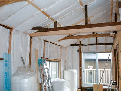 S様邸では、建物を解体して2階部分をスケルトン状態にしてから、外部に面した壁と床、天井に断熱材を施工します。 また、建物で熱の出入りが一番多い窓は、高性能なサッシに交換します。