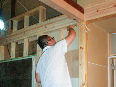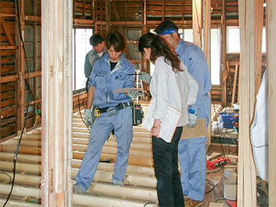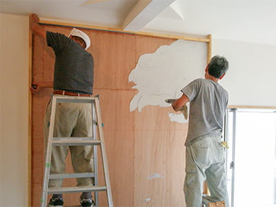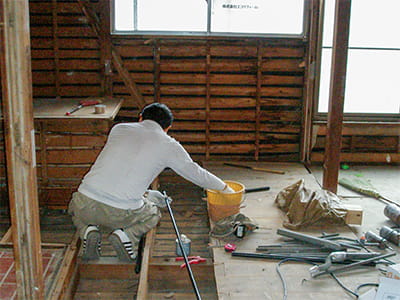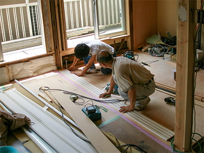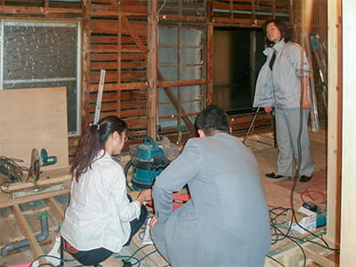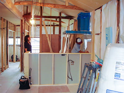 空っぽになった室内で、大工さんたちが補強や断熱施工などを行います。
