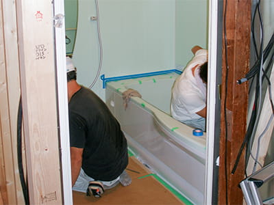 ユニットバスの施工は早めに行います。浴槽は大きいため、リフォーム工事が進んだ後では入らなくなってしまうためです。