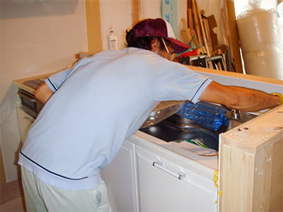 水道とガスの配管はすべて新しくします。それぞれの業者さんが入って対応してくれました。写真は作業中の水道屋さんです。
