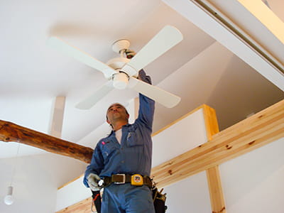 天井にはS様リクエストのシーリングファンを設置しました。 取り付け位置や高さもS様のご希望どおりです。