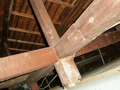 解体が終わって骨組みだけの状態になると、建築当時の大工さんが経験と勘で堅実な仕事をしていたことがわかりました。 とは言え、経年による老朽化が見られ、大がかりな補強が必要です。