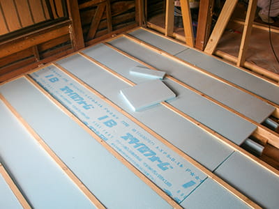 床下に断熱材を敷き詰め、倉庫になっている1階部分から冷気が上がってくるのを防ぎます。