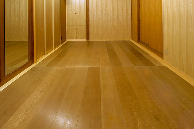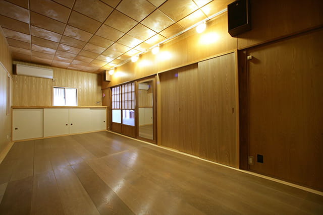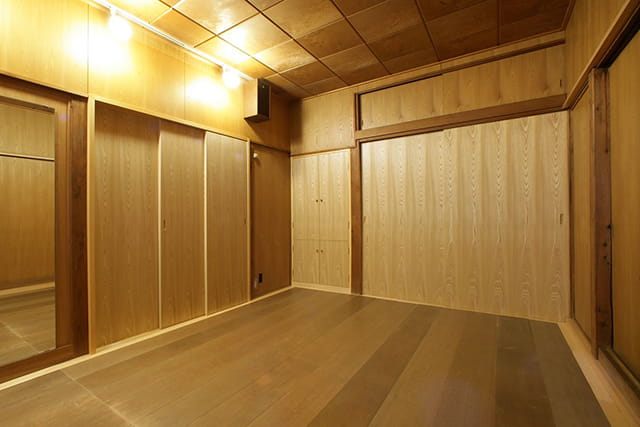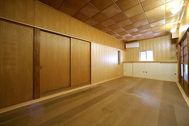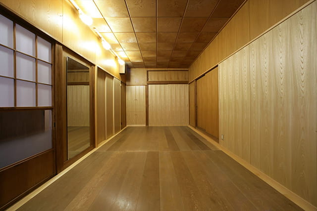 木曽ヒノキを丁寧に磨き上げてから取り付け、日本舞踊の稽古場としてふさわしい床に仕上げることができました。